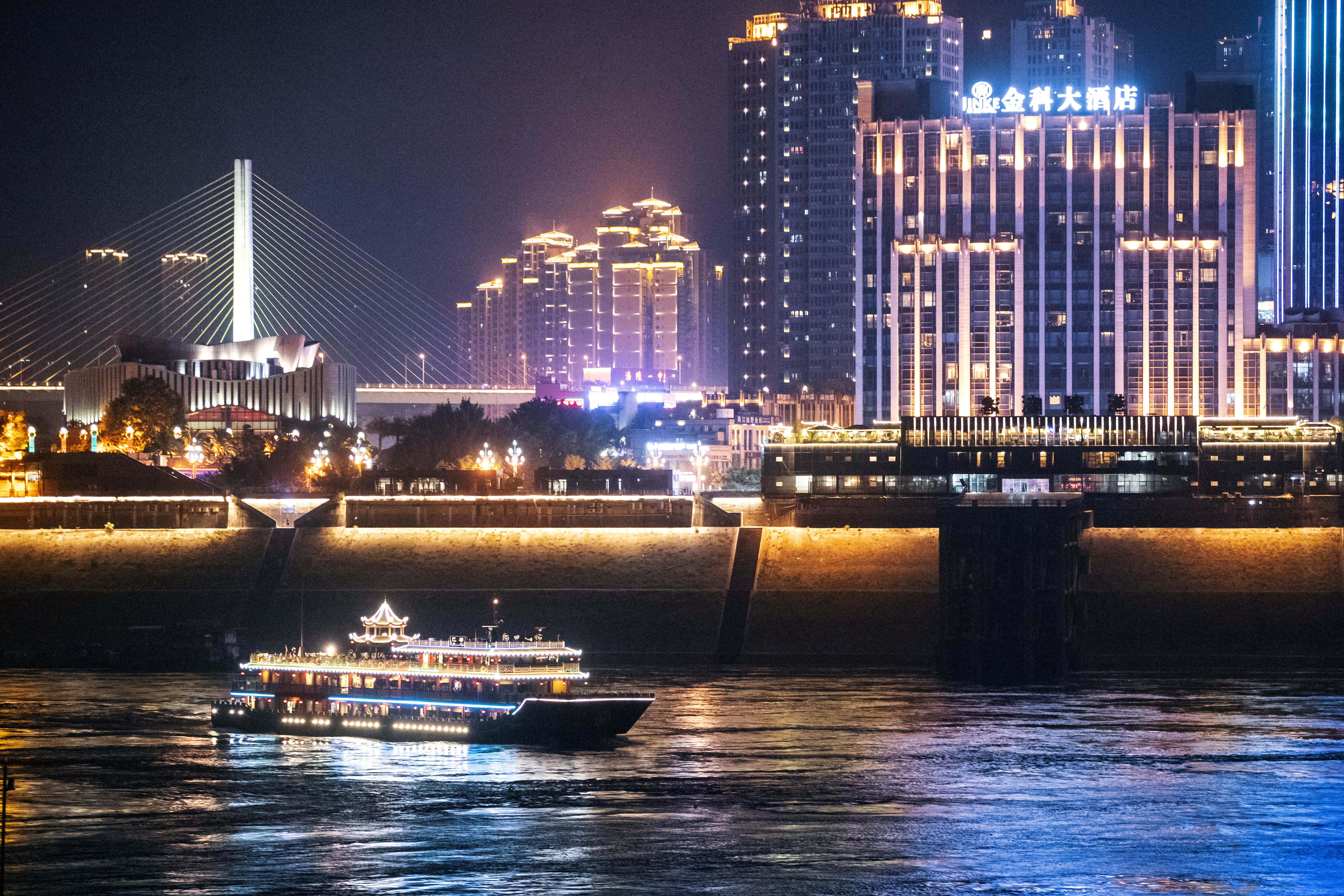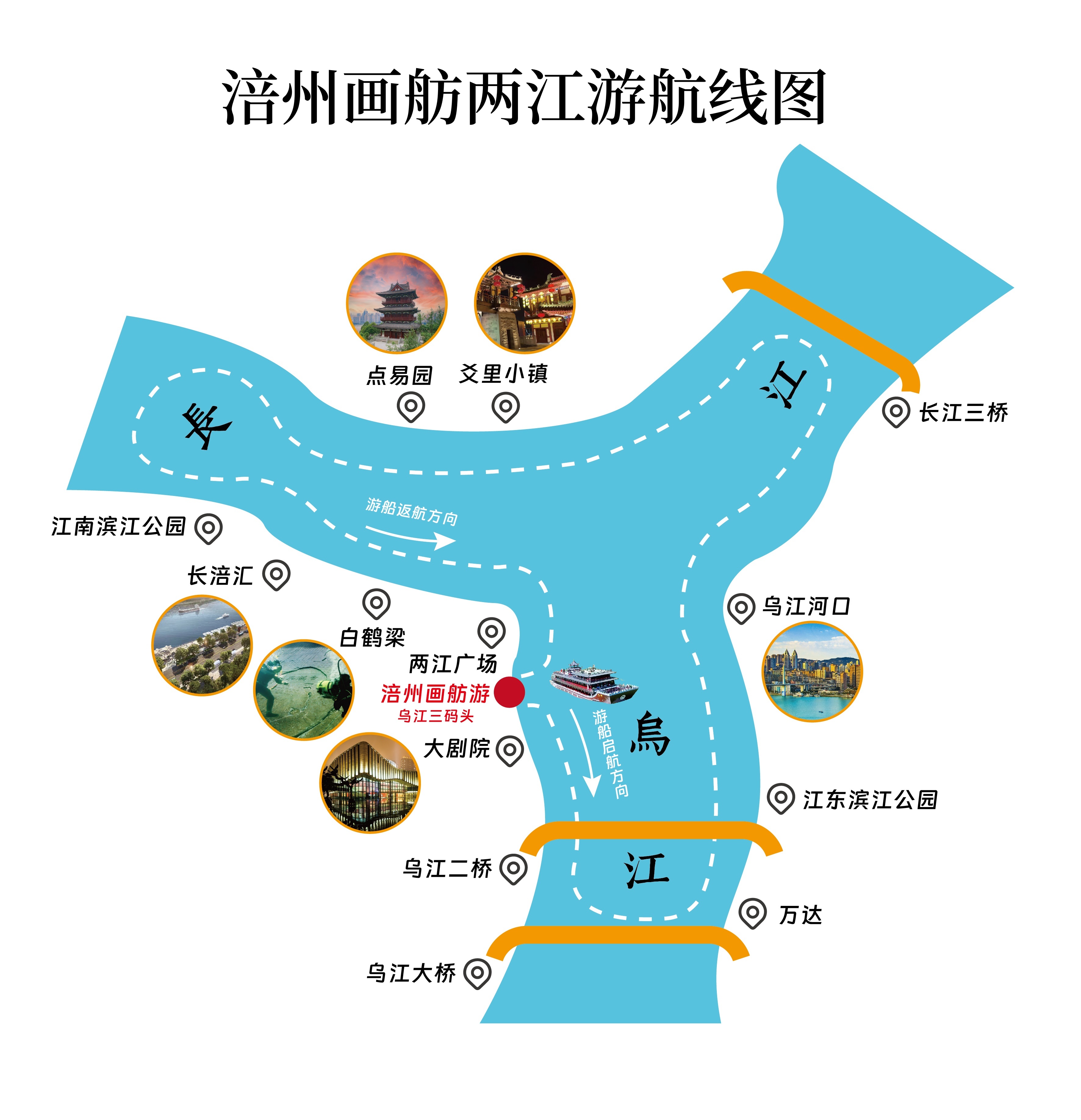 涪州画舫——两江夜游 由乌江三号码头启航,循乌江、长江观城市夜景,折返一圈,全程约12公里,大约用时50分钟。投入“巴都”“巴王”两艘游船运营,每艘游船每航次可接待游客294人次。