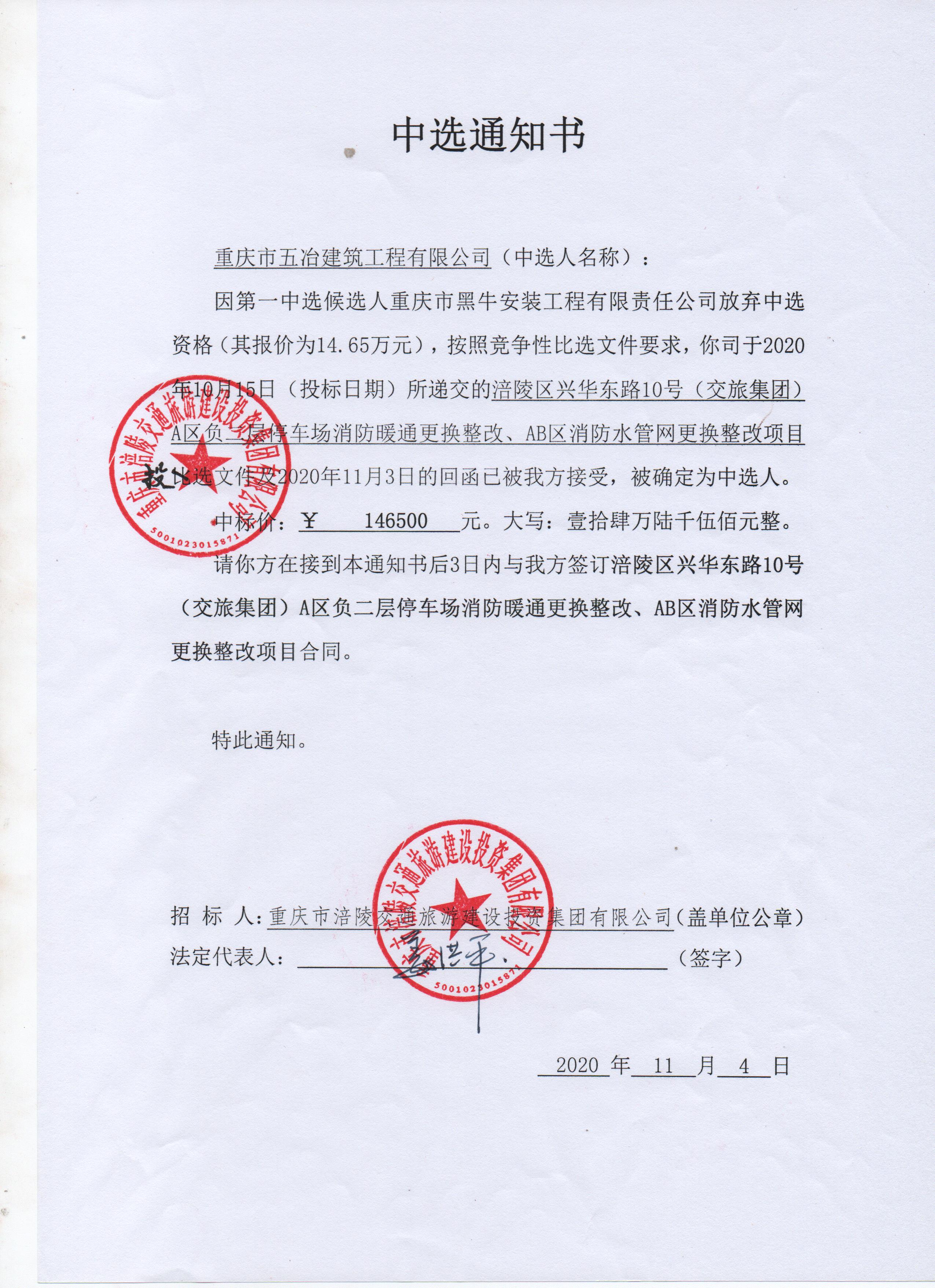 兴华东路10号(交旅集团)A区负二层停车场消防暖通更换整改、AB区消防水管网更换整改(竞争性比选)中标结果公示